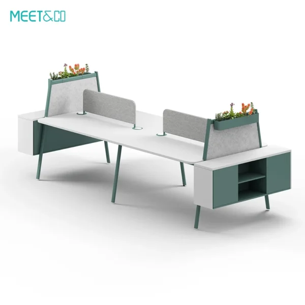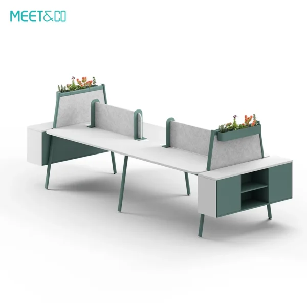 This desk stands out with its eco – conscious design. The built – in plant shelves not only bring a touch of nature into the office, improving air quality, but also create a more pleasant and relaxing work environment. It’s a great way to combine sustainability with aesthetics.